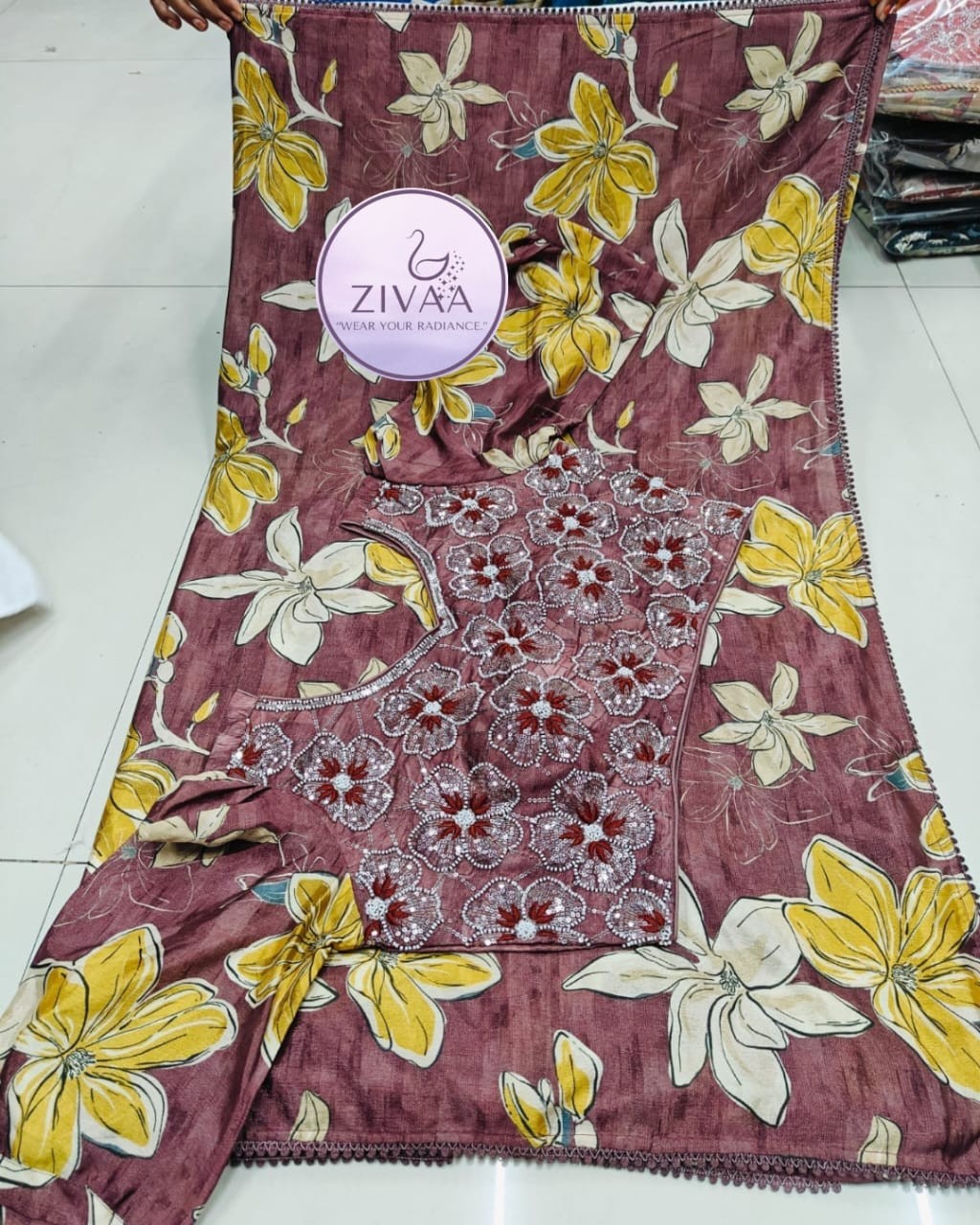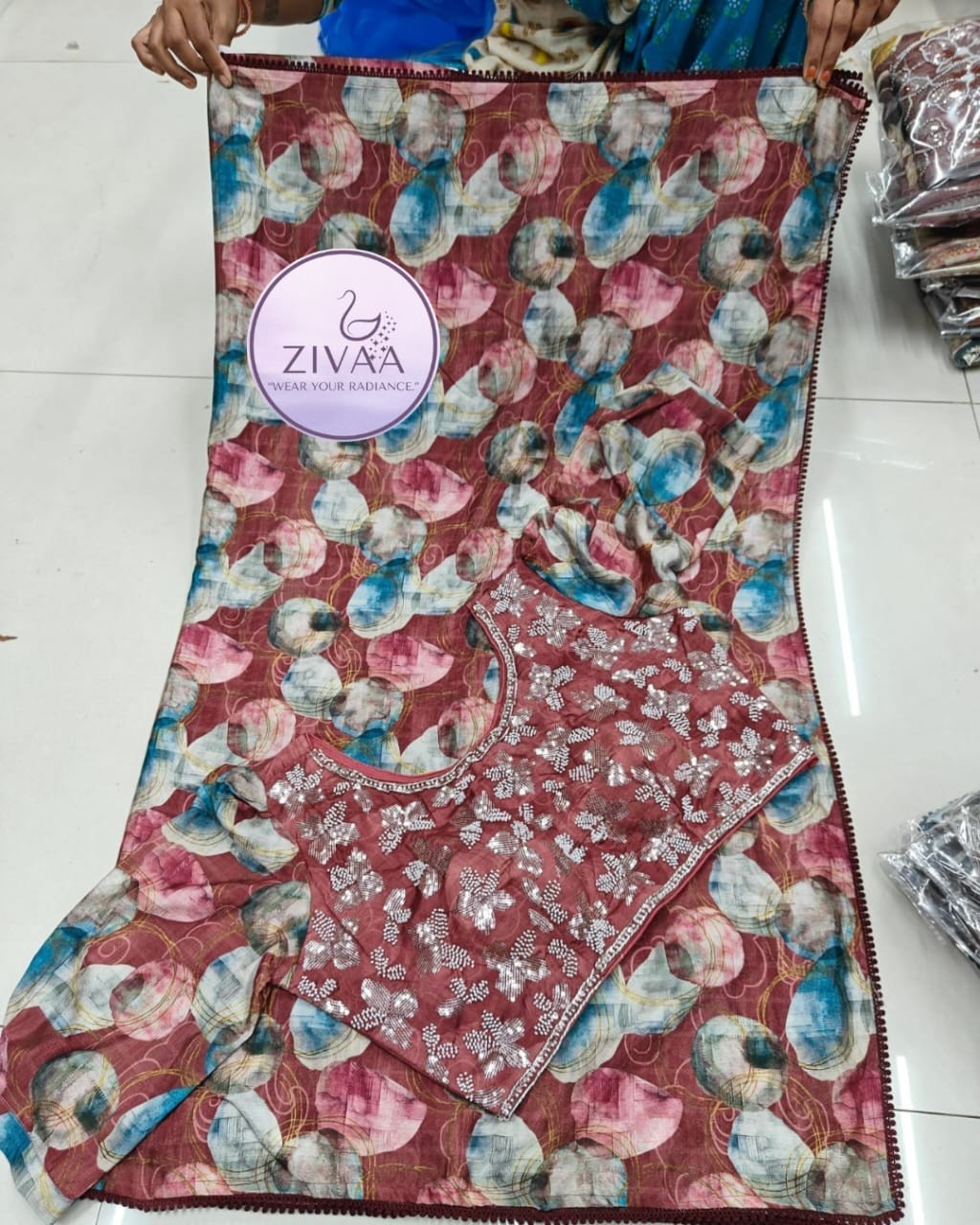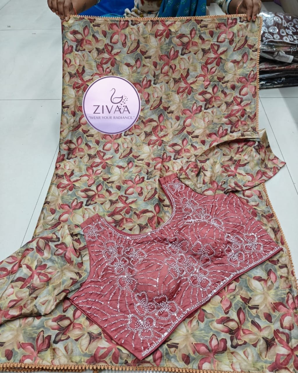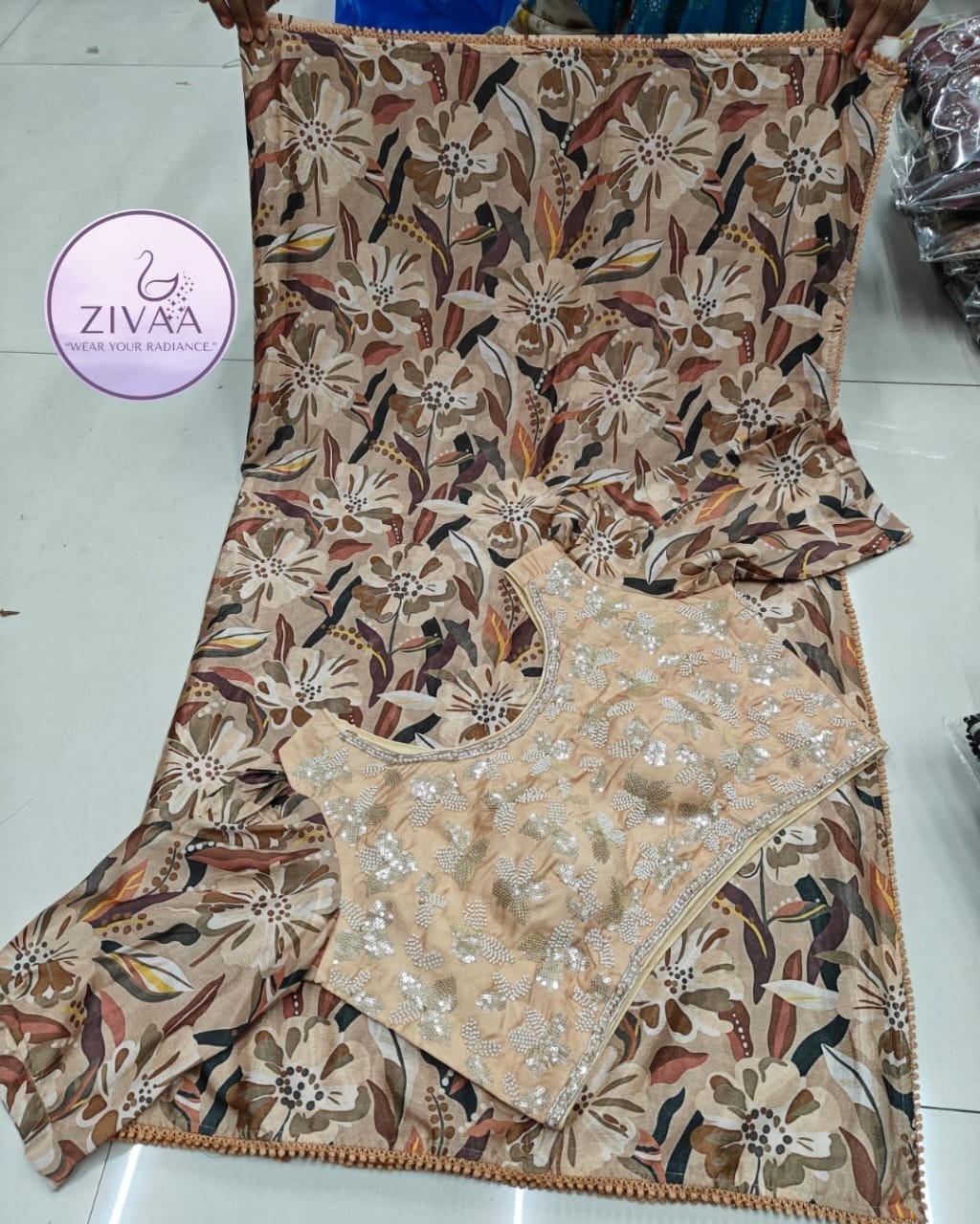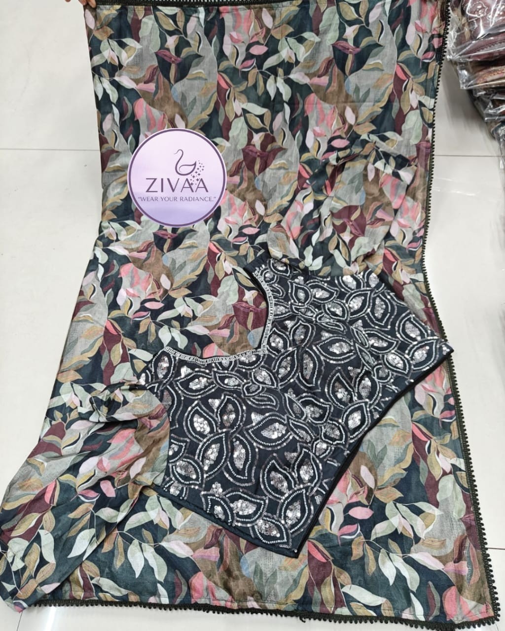 🍀NEW ARRIVALS🍀 Beautiful Designer Saree with crochet fancy borders and heavy handwork beats and sequence work stitched blouse Fabric : Chinon Digital Print Premium Quality Blouse : Fancy Stitched heavy handwork blouse size 42+2 Price 1199 only For Order Dm or Watsap on 9353950441